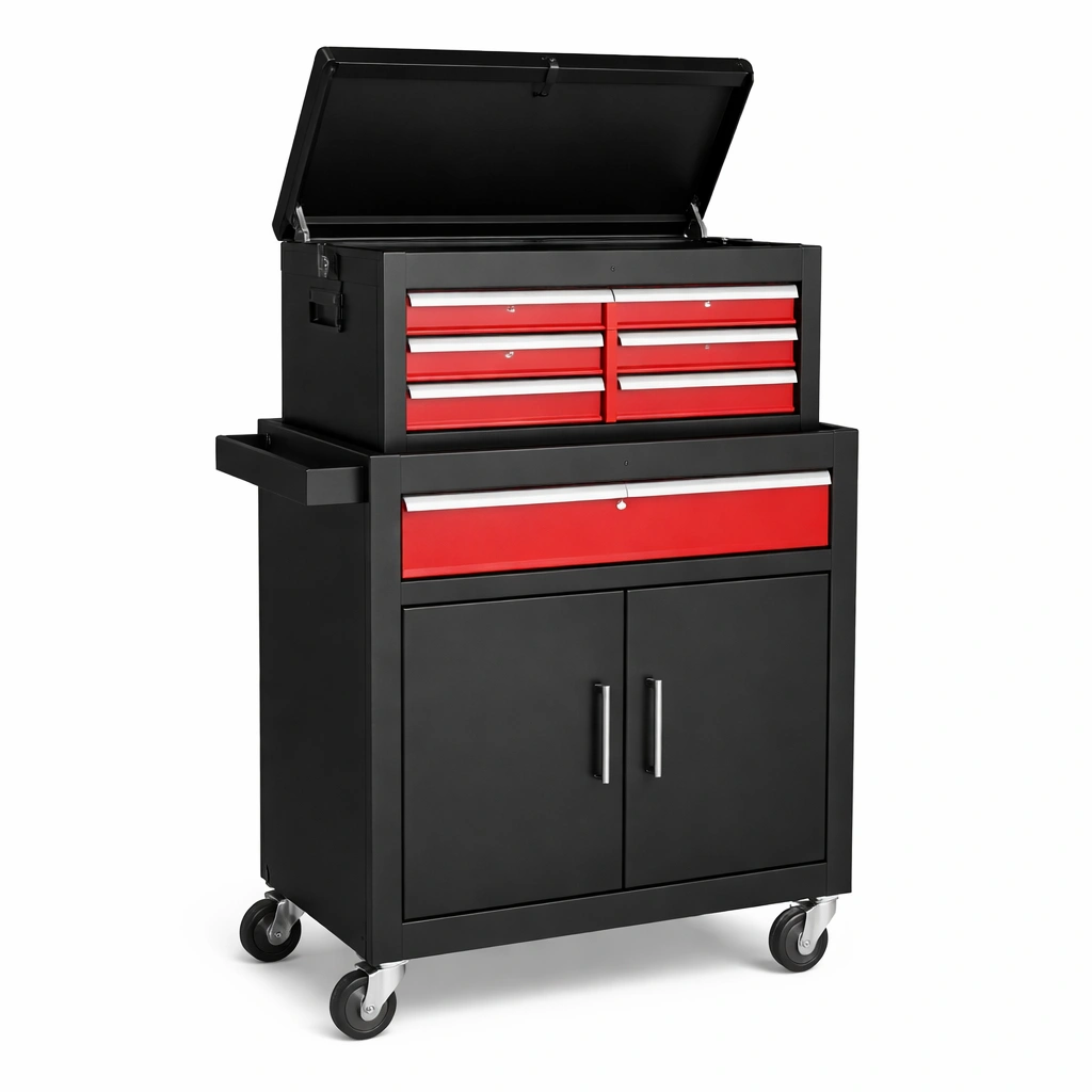 Carro de herramientas metálico negro rojo con 7 cajones y puertas