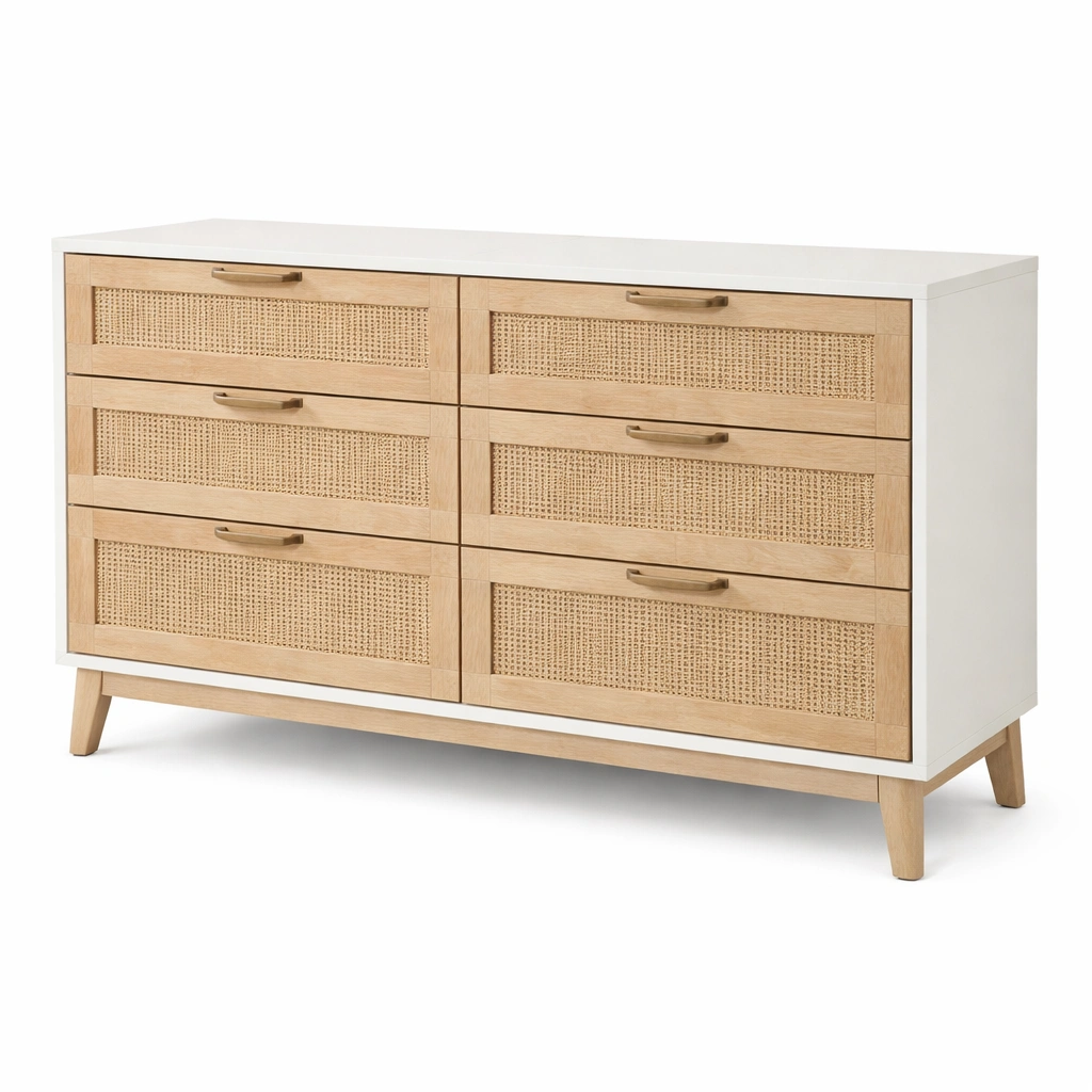 La cómoda presenta una estructura de MDF con acabado en barniz blanco. Los frentes de los cajones están elaborados con ratán tejido, y las asas son de metal. Sus dimensiones son 120 cm de longitud, 40 cm de anchura y 75 cm de altura. El peso neto es de 35 kg. Incluye seis cajones para almacenamiento.