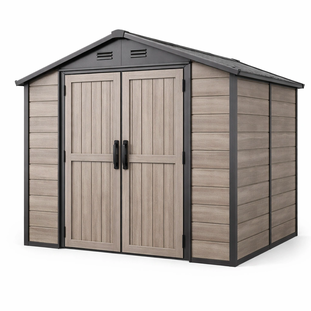 Caseta de jardín construida con paneles de plástico reforzado. Incluye un marco robusto y techo inclinado. Ofrece protección UV e impermeabilidad, adecuada para almacenar herramientas de jardín y equipamiento mediano. Dispone de un sistema de ventilación integrado en el techo para asegurar la circulación del aire.