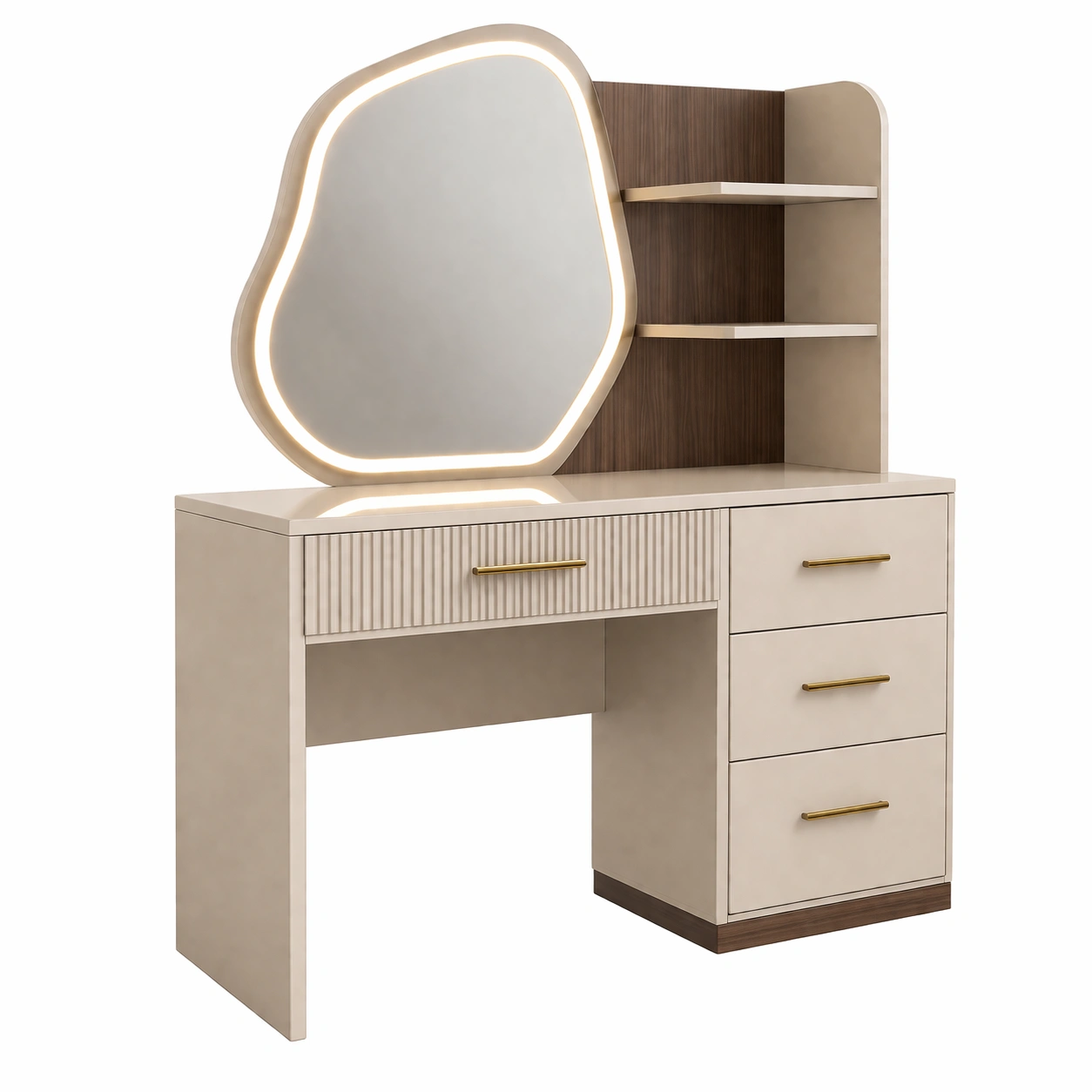 Este tocador está fabricado en MDF con un acabado en melamina. Incluye un espejo de forma irregular con iluminación LED. Tiene un cajón grande y tres cajones pequeños en un lateral, además de dos estantes para almacenamiento adicional.