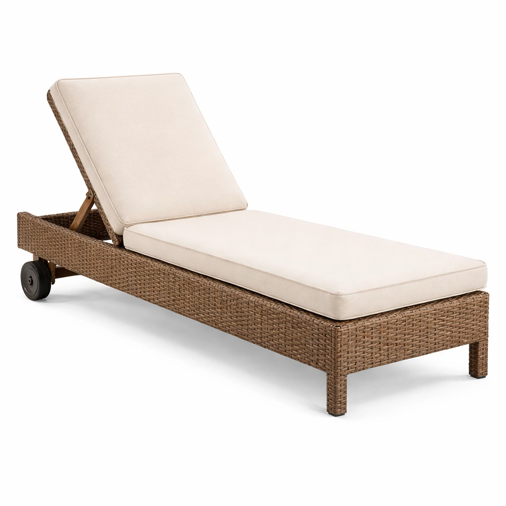 Estructura de ratán sintético. Cojines de poliéster con relleno de espuma. Longitud de 190 cm, ancho de 60 cm, altura de 30 cm. Peso total 12.5 kg. Color marrón y beige. Respaldo ajustable con ruedas para movilidad. Limpiar con paño húmedo. Resistente al agua y a los rayos UV.