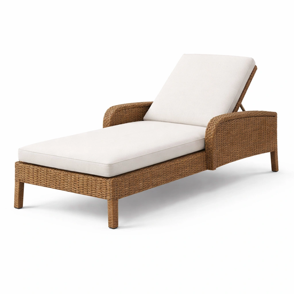 Esta tumbona está fabricada con una estructura de ratán sintético y cuenta con un cojín relleno de espuma de poliuretano. Las dimensiones son: longitud total de 200 cm, ancho total de 75 cm y altura total de 85 cm, con una altura de asiento de 40 cm.